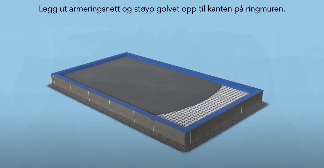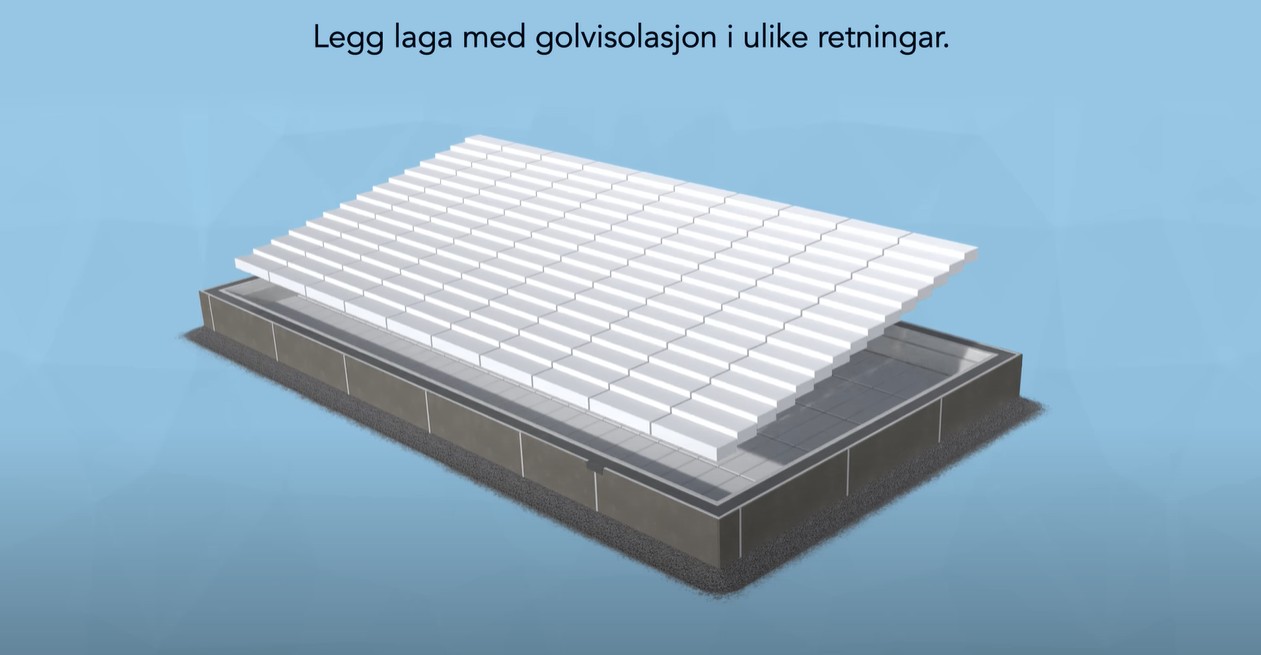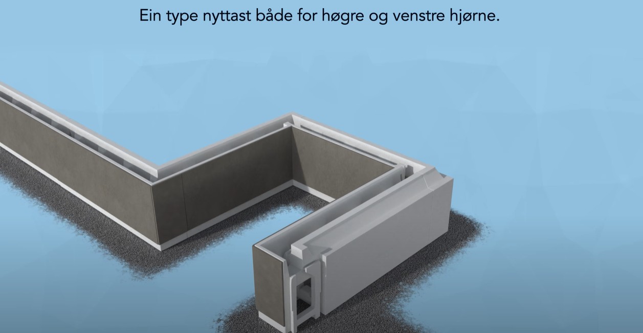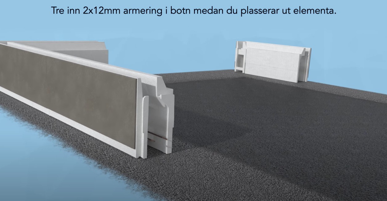 Systemet bygges opp med L-elementene, innvendig isolasjon og plassering av radonsperre før alt sammen støpes i en omgang. En effektiv byggemetode.