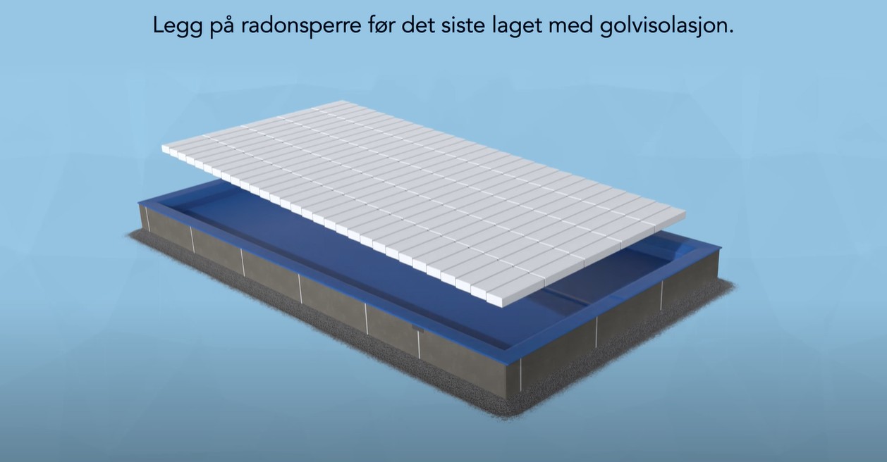 Radonblokk brukes nederst i konstruksjonen. Dette mangler knaster på ene siden, slik radonsperren kan føres ut i mellom EPS-vangene og inn i betongkjernen. Elementene låses sammen ved bruk av festekiler.